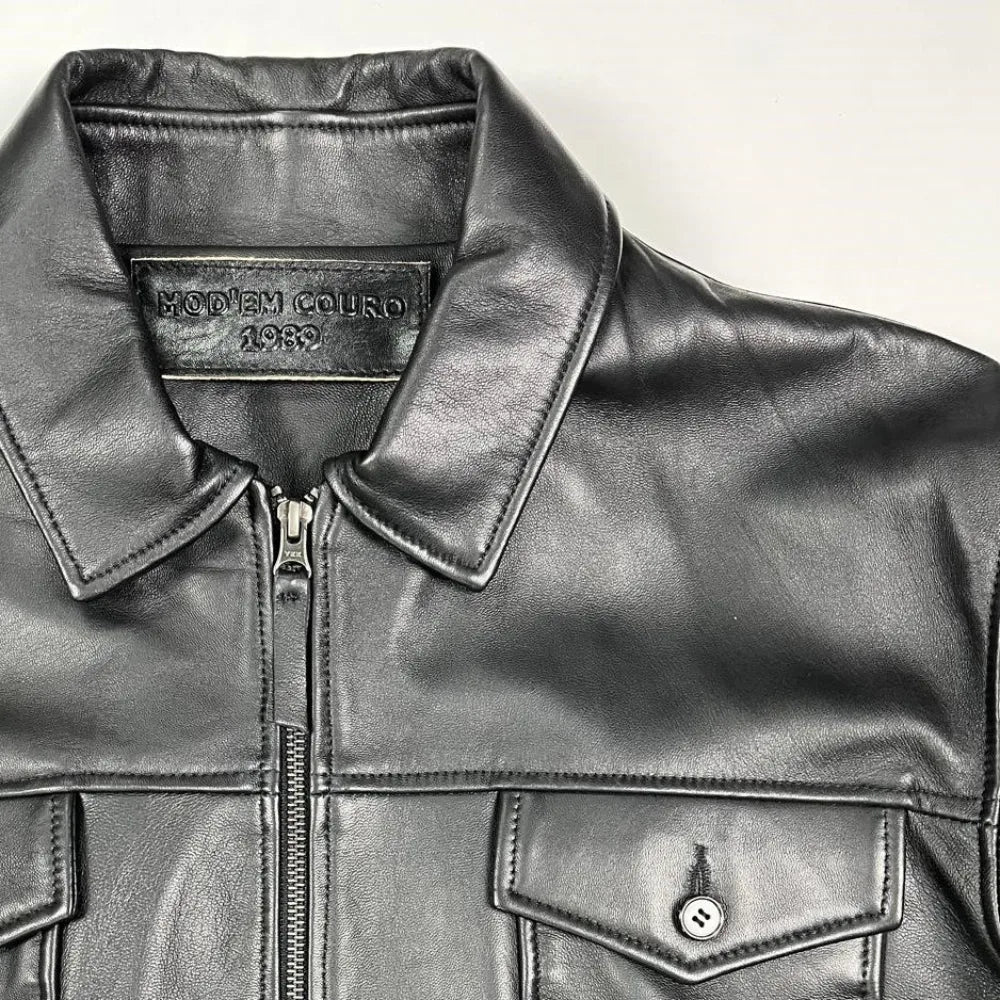 O casaco em pele Gio é uma peça icónica que combina o charme da cor preta com um design contemporâneo e bolsos frontais com botão. Fabricado pela MOD'EM COURO, este produto é perfeito para quem procura estilo, conforto e durabilidade num único item.